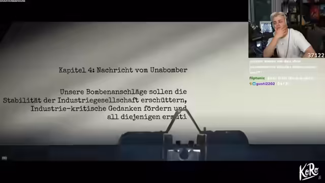 01:23:53Nach dem gelösten Kriminalfall wechselt der Stream zu einem investigativen Thema. Es geht um Theodore Kaczynski, besser bekannt als der Unabomber. Der Stream analysiert seine Biographie: von seiner frühen Hochbegabung und traumatischen Erfahrungen als Student an der Harvard-Universität unter Professor Murray, bis zu seinem Rückzug in eine einsame Hütte in Montana. Dort begann er mit den Bombenanschlägen als Protest gegen die Industriegesellschaft.