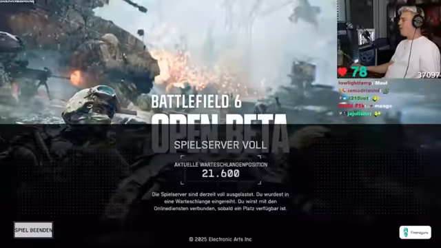 02:13:43Der Streamer stößt bei der Vorbereitung des Battlefield-Spiels auf erhebliche technische Schwierigkeiten. Sein Streaming-Software OBS stürzt mehrfach ab, was auf Probleme mit einem Grafiktreiber und einem fehlenden Dual-PC-Stream-Setup hindeutet. Nach einem Neustart gelingt es ihm jedoch, das Spiel zu starten. Er bittet im Discord einen Freund namens Lukas (Mango) für ein gemeinsames Spiel ins Team, während der Chat mit humorvollen Reaktionen auf die Missgeschicke und den Spielstil des Streamers reagiert.