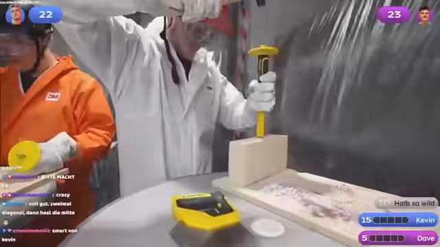 04:45:35Die IRL-Olympade beginnt mit der Suche nach einer geeigneten Waage, da eine Personenwaage zu ungenau für die geplanten Gramm-Messungen ist. Man entscheidet sich, zunächst mit einem Spider-Man-Item zu wiegen, was jedoch zu einem unvorhergesehenen Problem führt. Der Streamer Dave möchte einen schweren Steinblock in der Hälfte teilen, um die Genauigkeit zu messen. Nach einer Taktikberatung wird der Block mit einem Hammer zerschlagen, was eine lautstarke und chaotische Aktion auslöst, die im Stream für großen Andrang sorgt.