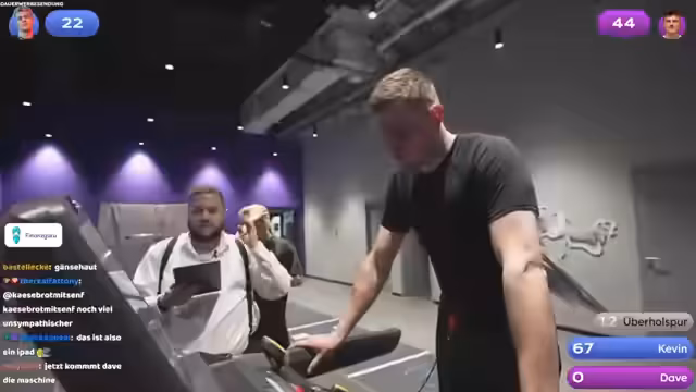 05:22:31Auf dem Laufband wird die Geschwindigkeit mit jeder falschen Frage um 1,5 km/h erhöht. Kevin bricht nach anstrengenden Fragen bei 14 km/h ab, während Dave die gleiche Anzahl an Fragen bewältigt. Die Herausforderung erfordert nicht nur Wissen, sondern auch enorme körperliche Anstrengung und Geschwindigkeit. Die körperlichen Grenzen werden ausgelotet, als die Teilnehmer unter hohem Druck stehen, richtig zu antworten, um die Geschwindigkeit nicht noch weiter erhöhen zu müssen. Der Spaß und die Anstrengung stehen im Mittelpunkt dieses letzten, fordernden Spiels.