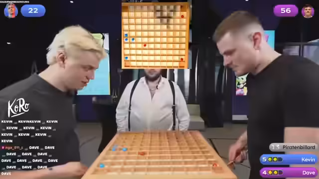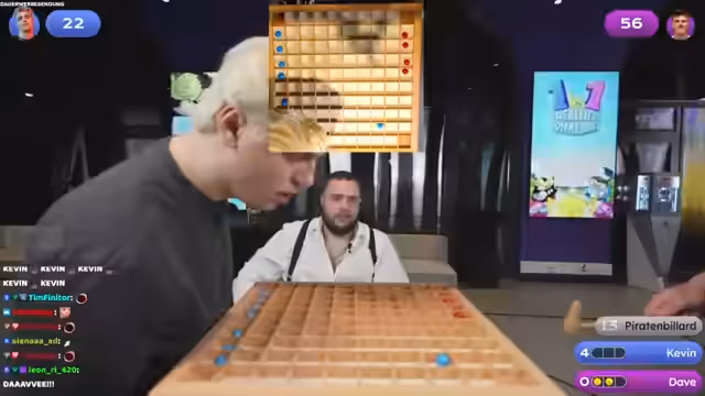 05:45:42Aufgrund des Sieges von Dave im zwölften Spiel wurde das ursprünglich als finales geplante Spiel 'Piratenbillard' vorgezogen, da Dave nun einen Matchball hat. Der Streamer betonte die Wichtigkeit eines Finalspiels und ließ die Teilnehmer kurz durchatmen, bevor es in die nächste Runde ging. Der aktuelle Gesamtpunktstand stand bei 22:56, was zeigt, wie eng die Gesamtkonfrontation ist.