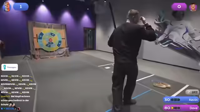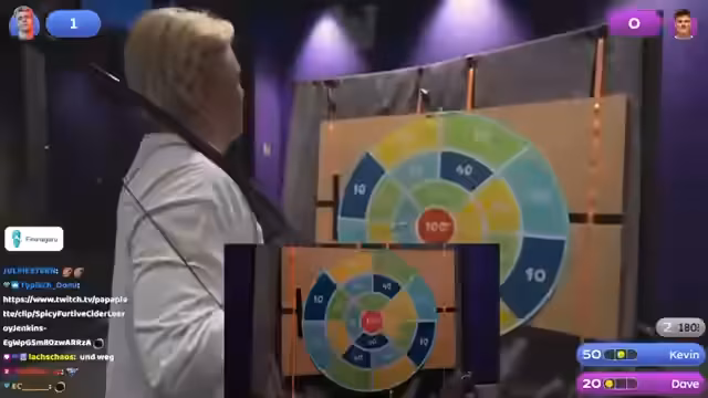 00:51:59In der Mitte des Bogenschieß-Spiels ergeben sich für Kevin massive Fehlschläge. Seine Pfeile bleiben nicht in der Scheibe stecken oder landen in niedrig bewerteten Feldern. Dave hingegen kann seine Führung weiter ausbauen und bringt sich damit einen entscheidenden Schritt näher an den Sieg. Auch wenn er nicht immer ins Zentrum trifft, erzielt er deutlich mehr Punkte. Die Kommentatoren und der Streamer loben Daves souveräne Leistung und scherzen über die Nerven von Kevin, der den Druck zu spüren scheint.