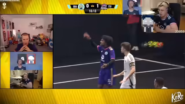 05:00:43Die Streamer starten in das erste 4-gegen-4-Match. Es werden grundlegende Spielzüge wie Pässe, Tackles und Konter gezeigt. Ein wiederkehrendes Problem ist das unklare Rollenverständnis, insbesondere bei der Position des Torwarts. Immer wieder kommt es zu Missverständnissen, weil der letzte Spieler im Feld automatisch als Torwart fungiert. Die Streamer betonen die Notwendigkeit von Teamplay und Kommunikation, auch wenn das im hektischen Spielverlauf schwierig ist. Sie feiern ihren ersten Sieg jubelnd.