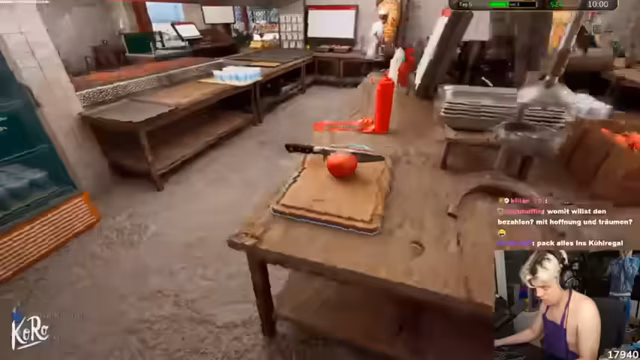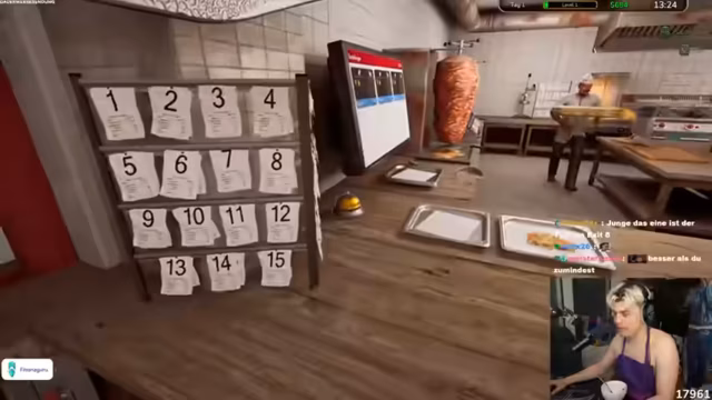 04:58:58Ein neuer Tag im Dönerladen beginnt. Die Küche ist sauber, aber die Inventarsituation ist prekär. Der Streamer versucht, die verbleibenden Zutaten optimal zu nutzen und Kunden zu bedienen. Trotz anfänglichem Erfolg und Trinkgeldern, zeigt sich der Betrieb als anstrengend und chaotisch, was zu einem geplatzten Laden und resignierten Kommentaren führt.