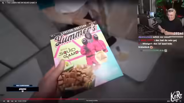 01:18:23Der Streamer äußert seine Enttäuschung darüber, dass das Pistazienmüsli kaum Füllung enthält und kritisiert den Game Master für die Täuschung. Der Gag über Dubai wird als unpassend und unnötig wiederholt empfunden. Es wird angemerkt, dass die Verkostung des Müslis lieblos wirkt. Der Streamer fordert, dass das Müsli endlich in Milch gegeben wird und bereitet mit seinem Kollegen eine Milchmischung zu, obwohl die Milch abgelaufen aussieht. Nach dem Probieren der Milchmischung wird der Geschmack als gut befunden. Der Streamer vermutet, dass das Essen eine Abstimmung darüber einleiten könnte, ob die Teilnehmer das Spiel verlassen wollen, glaubt aber nicht, dass dies tatsächlich geschehen wird. Bisher seien nur zwei von elf Minuten des Videos tatsächlich Squid Game-bezogen gewesen, der Rest sei lediglich 'Rambling'. Der Streamer bemerkt, dass etwas in ein Getränk geworfen wurde und vermutet eine Vergiftung. Anschließend werden Dosen mit Melonen- und Mango-Geschmack entdeckt, die der Streamer aus TikTok kennt und als möglicherweise illegal einstuft. Er äußert die Hoffnung, dass die Teilnehmer des Videos das kommende Spiel überleben werden.