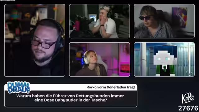 02:53:32Es werden Quiz-Fragen zu Hauptstädten und Flaggen verschiedener Länder und Bundesländer gestellt. Anschließend wird die Frage aufgeworfen, was ein Lochsponsor ist. Es werden verschiedene Ideen diskutiert, wie der Sponsor eines Golfturniers oder jemand, der beim Minigolf versehentlich die Kugel des Gegners ins Loch befördert. Die richtige Antwort ist, dass ein Lochsponsor ein Sponsor ist, der ein Loch auf einem Golfplatz sponsert und auf der Fahne abgebildet ist. Basti liefert die richtige Antwort. Danach wird die Frage gestellt, warum die Führer von Rettungshunden immer eine Dose Babypuder in der Tasche haben. Es werden verschiedene Theorien aufgestellt, wie zur Wundversorgung, zur Neutralisierung von Gerüchen oder als eine Art Hundekokain. Die richtige Antwort ist, dass der Hundeführer das Babypuder verwendet, um die Windrichtung zu bestimmen, indem er eine Prise in die Luft wirft. So kann er den Hund gegen den Wind ansetzen, um die Fährte besser zu verfolgen.