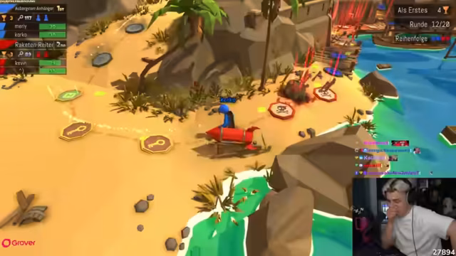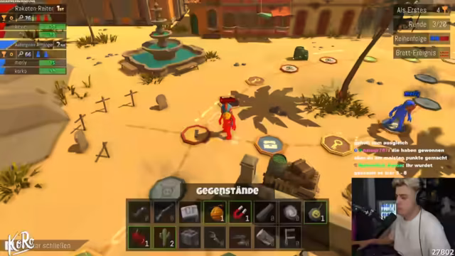 03:47:56Die Teams für 'Pummel Party' werden ausgelost. Kroko und Basti bilden ein Team, während Merle und der Streamer das andere Team bilden. Es wird um eine Autogrammkarte gespielt: Das Verliererteam muss dem Gewinnerteam eine gewidmete Autogrammkarte schicken. Der Streamer stellt Fragen zu den Einstellungen im Spiel, wie Spielmodus, Karte und Rundenanzahl. Es wird die klassische Piratenparadies-Karte mit 20 Runden und 4 Pokalen zum Sieg gewählt. Das Spiel beginnt, und der Streamer hat Pech beim Würfeln. Es werden Strategien besprochen, und der Streamer teilt sich mit seinem Teampartner auf, um Items zu sammeln. Es folgt ein Minispiel, bei dem die Spieler Buchstaben einsammeln müssen, um ein Wort zu bilden. Der Streamer und sein Teampartner haben Schwierigkeiten, während das gegnerische Team schneller ist. Der Streamer erkennt, dass es auch Punkte für die einzelnen Buchstaben gibt.