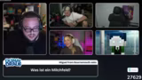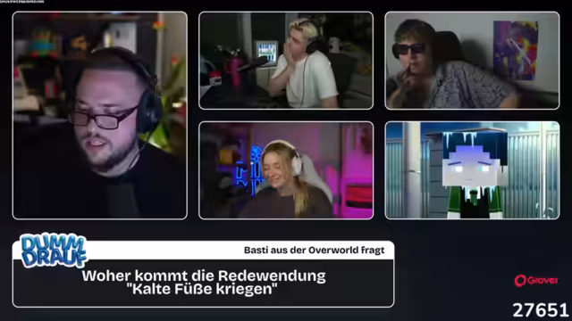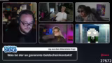 01:27:30Der Stream beginnt offiziell mit dem Start der Game Show 'Dumm drauf'. Dominik Rehzmann begrüßt das Publikum und stellt die Teilnehmer vor: Kevin, Paul, Merle und Basti. Jeder der Teilnehmer stellt sich mit drei Fakten über sich vor. Nach der Vorstellung beginnt das erste Rätsel der Show, das als 'Geldscheinkontakt' bezeichnet wird. Nach einer langen Diskussion und vielen falschen Vermutungen wird das Rätsel schließlich gelöst.