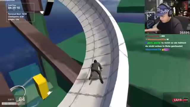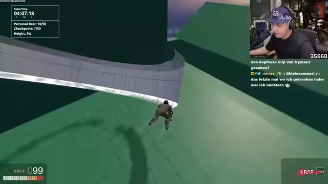 02:56:47Der Streamer scheitert mehrfach am Parcours, was ihn extrem frustriert und zu peinlichen Momenten führt. Gleichzeitig wechselt er zu unzusammenhängenden, witzigen politischen Kommentaren, wie die Gründung einer imaginären Partei mit Programmpunkten wie Döner-Preisregulierungen und dem Verbot von BHs für Frauen. Dies unterstreicht seine humoristische und absurde Art während des frustrierenden Spiels.
