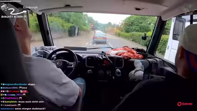 00:32:21Nach kurzer Verzögerung wegen verschwundener Autoschlüssel startet die Fahrt nach Edinburgh. Der Fahrer entscheidet sich für eine Route, die durch die Stadt führt, statt direkt aus dem Parkplatz herauszufahren. Es werden humorvolle Überlegungen angestellt, was man alles für die Edeltour optimieren könnte: 'Dusche raus, dafür mehr Stauraum, Fernseher raus'. Der Streamer zeigt großes Interesse an zukünftigen Kooperationen, etwa mit Mercedes für einen Unimog.