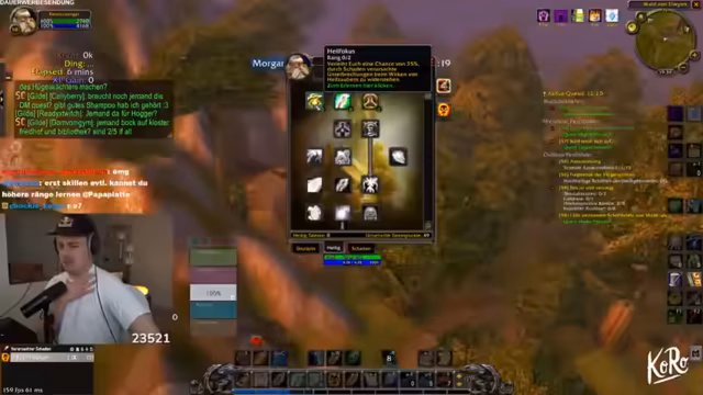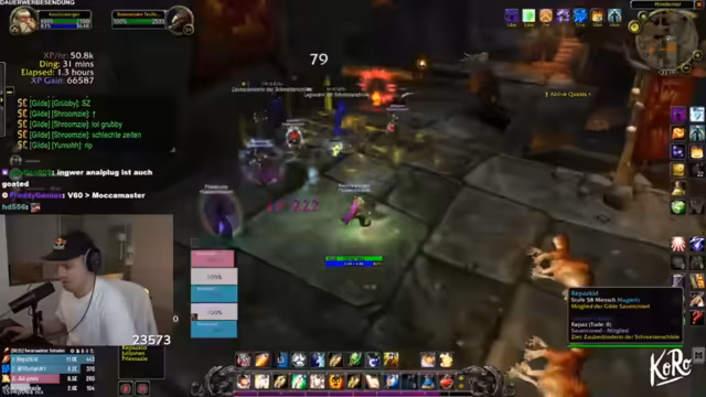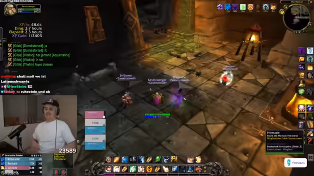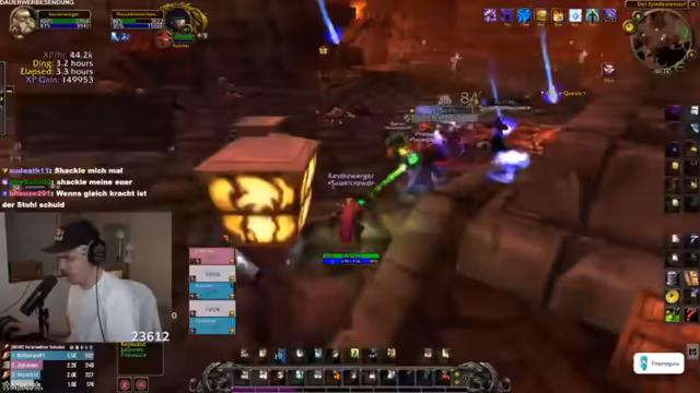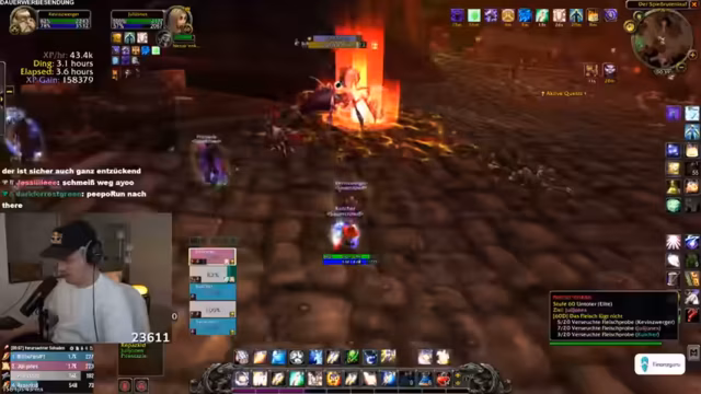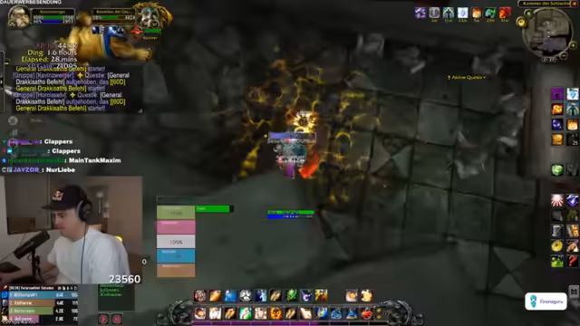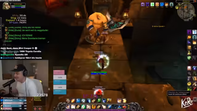 04:50:30Der Stream konzentriert sich intensiv auf das Spielgeschehen in einem RPG, wahrscheinlich World of Warcraft. Die Gruppe ist im Enderstadium des Level-ups und benötigt nur noch eine kleine Menge an Erfahrungspunkten. Der Streamer koordiniert die Gruppe, gibt Anweisungen für Bosskämpfe und Quests, und es kommt zu humorvollen Auseinandersetzungen über Spielstrategien und Rollenverteilung, insbesondere zwischen Tank und Heiler. Gemeinsame Ziele wie das Farmen von bestimmten Gegenständen und das erfolgreiche Absolvieren von Instanzen stehen im Mittelpunkt der interaktiven Gameplay-Phase.