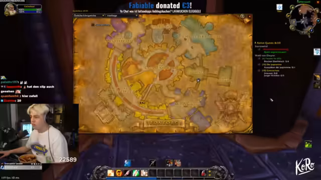 05:13:21Die Streamer bereiten sich darauf vor, Quests in einer Stadt abzugeben und erkunden dabei ihre Umgebung. Sie diskutieren über das Loot-System und die Verteilung von Items zwischen den Teammitgliedern. Dabei werden auch technische Aspekte wie das Auto-Loot-Add-On angesprochen. Sie planen ihre weiteren Schritte im Spiel, einschließlich des Besuchs von Sturmwind zur Kriegerausbildung.