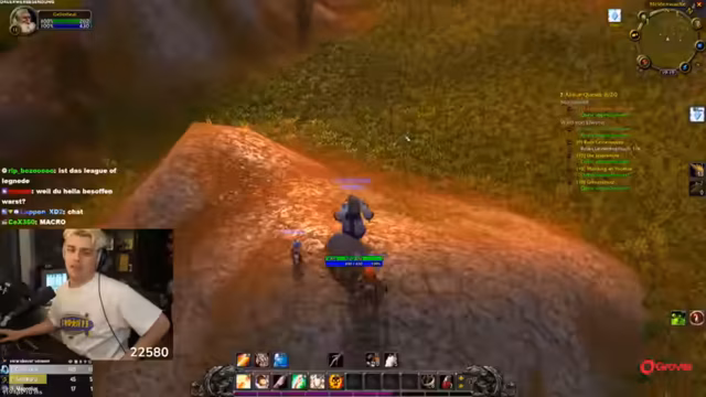 05:41:56Die Gruppe beobachtet einen Schurken der Stufe 12, der Hogger alleine bekämpft, und ist beeindruckt von dessen Fähigkeit, den Elite-Mob zu besiegen, insbesondere da der Schurke einen Buff namens 'Schlachtruf der Drachentöter' besitzt, der ihm doppeltes Leben und siebenfachen Schaden verleiht. Dies führt zu einer Diskussion über die Fairness solcher Buffs. Später entscheidet sich die Gruppe, Hogger erneut zu besiegen, obwohl dies keinen direkten Nutzen bringt, in der Hoffnung auf besseren Loot. Währenddessen müssen die Spieler weiterhin Gnoll-Armbinden sammeln, was sich als mühsam erweist, da die Drop-Rate gering ist und andere Spieler ebenfalls in dem Gebiet unterwegs sind.