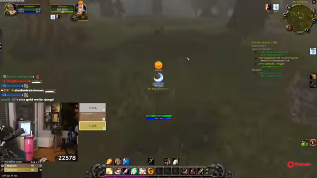 09:35:57Die Streamer nehmen Quests an und kämpfen gegen Monster im Gebiet Westfall. Sie sammeln verschiedene Gegenstände wie Hafer-Säcke und kämpfen gegen Staubteufel und Elementarwirbelwind. Wieland warnt davor, zu viele Monster auf einmal anzuziehen, da dies tödlich enden könnte. Sie unterhalten sich auch über das Verkaufen von Gegenständen und stellen sicher, dass sie nur verkaufen, was sie nicht selbst benötigen. Dominik stirbt während der Quests, was humorvoll als 'klassischer Content-Tod' bezeichnet wird.