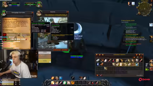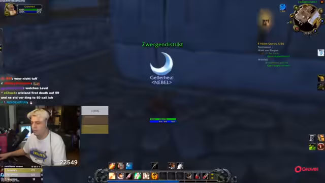 09:05:00Die Streamer beschließen, einige Quests abzubrechen und nach Sturmwind zurückzukehren, um ihre Berufe zu leveln und neue Fähigkeiten zu erlernen. Während des Fluges nach Sturmwind wird die malerische Route und die Möglichkeit, die Karte zu überblicken, positiv hervorgehoben. Es wird erwähnt, dass sie über Gebiete fliegen, die sie noch nie zuvor gesehen haben, einschließlich der brennenden Steppe, wo sich der Raid für Level 60 befindet, den sie im Event versuchen wollen. Nach der Ankunft in Sturmwind trennen sich die Wege der Streamer, um ihre jeweiligen Klassenlehrer und Berufslehrer aufzusuchen. Es wird diskutiert, ob Priester auch Erste Hilfe lernen sollten, was bejaht wird. Wieland berichtet, dass er bereits nützliche Dinge mit seinen Berufen herstellen kann, wie Rüstungs- und Stärke-Elixiere, was als "übertrieben geil" und "brutal Spaß" machend empfunden wird.