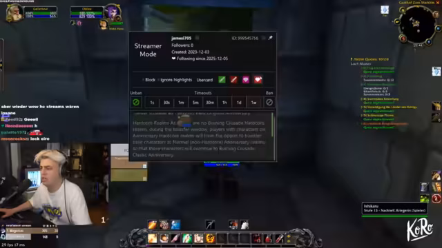 08:16:24Es wird über die Teilnahme an einem WoW-Hardcore-Event von Itachi gesprochen. Ein Spieler äußert Bedenken bezüglich des Timings des Events im Dezember, da im Januar die Hardcore-Server angeblich "down gehen" sollen. Dies führt zu einer Diskussion über die Zukunft der Hardcore-Server im Kontext des kommenden "Burning Crusade"-Add-ons. Es stellt sich heraus, dass es keine Hardcore-Server in Burning Crusade geben wird und Charaktere auf normale, nicht-Hardcore-Server transferiert werden müssen, um Burning Crusade zu spielen. Die Spieler sind sich unsicher über die genauen Auswirkungen und die Richtigkeit der Informationen. Ein Spieler plant, in New York zu streamen, was die zukünftige Verfügbarkeit für gemeinsame Spielsessions beeinflussen könnte.