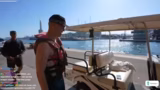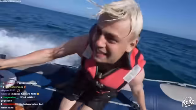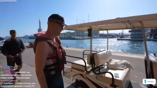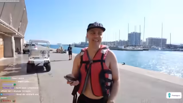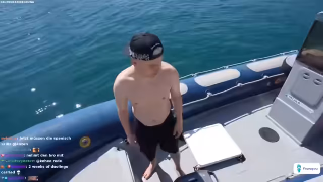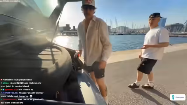 03:45:12Tim gelingt es nach einigen Anläufen, sich erfolgreich aus dem Wasser zu ziehen und eine kurze Fahrt auf dem Wakeboard zu absolvieren, was im Chat für Begeisterung sorgt. Trotz des Erfolgs wird die Wakeboard-Aktivität vorerst beendet, da der Zeitrahmen und die körperliche Belastung ihre Grenzen erreichen. Die Streamer schalten zu einer weiteren geplanten Aktivität über, dem Fahren eines Sportboots, das wie ein Auto aussieht. Sie verhandeln mit dem Bootsbetreiber über die Mietkosten und die Dauer des Ausflugs, wobei sie versuchen, den Preis herunterzuhandeln.