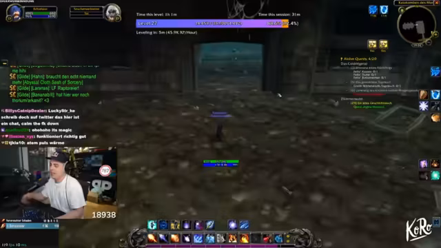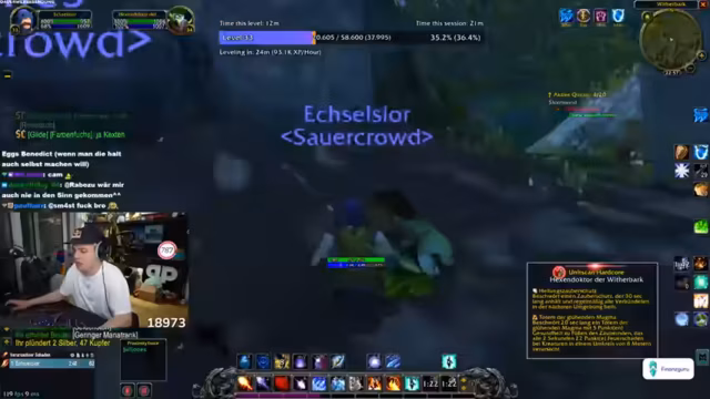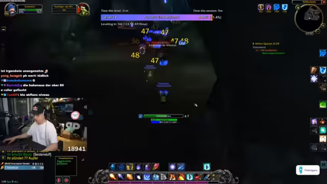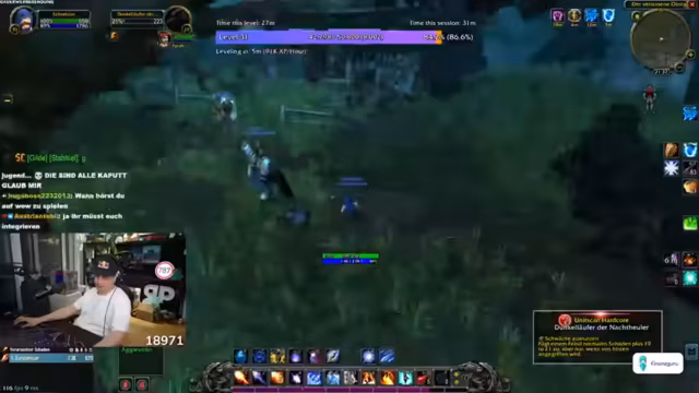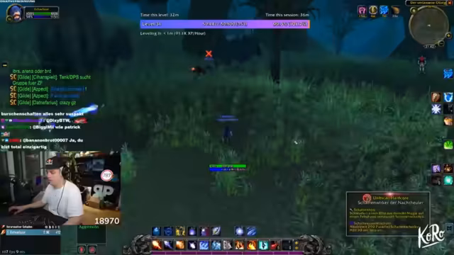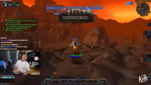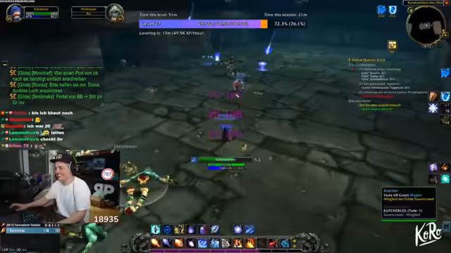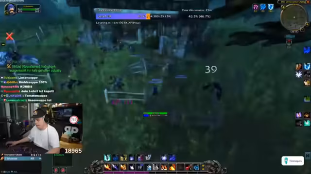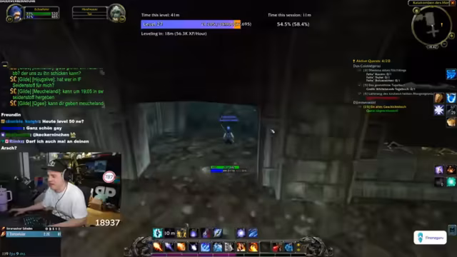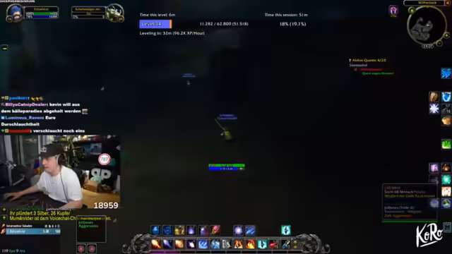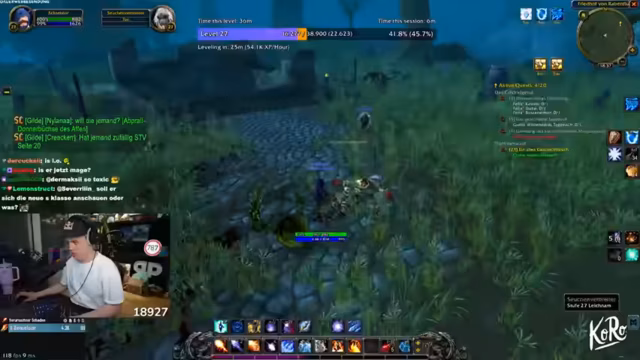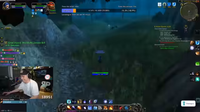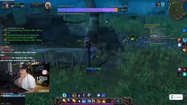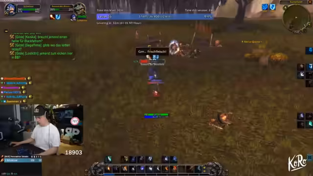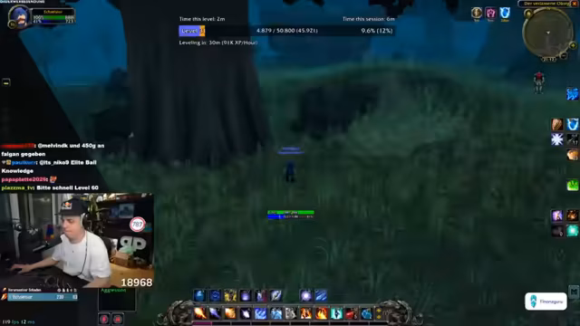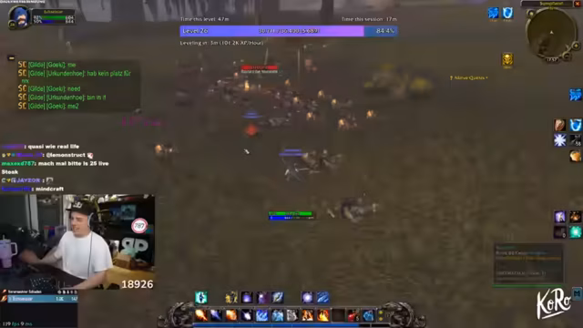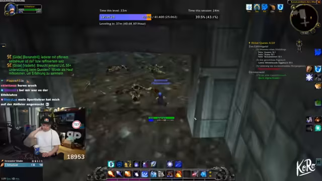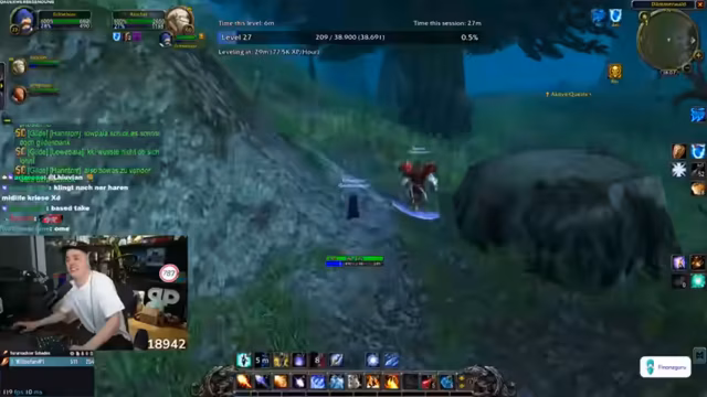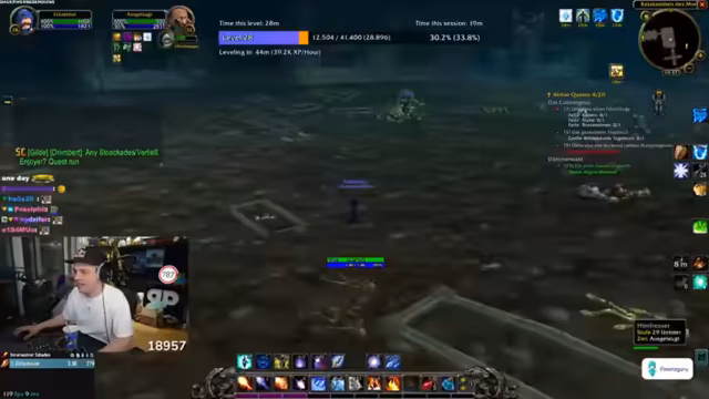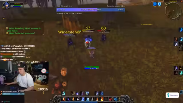 10:11:03Der Fokus des Streams verlagert sich wieder zum World of Warcraft-Gameplay. Der Streamer und seine Gruppe farmen intensiv XP, wobei es um die Verteilung von Aggo und das effiziente Pullen von Gegnern geht. Es werden Gegenstände wie Ringe getauscht und das Spielverhalten analysiert, wie beispielsweise der strategische Einsatz von Fähigkeiten wie "Eisblock" als Rettungsmanöver. Die Gruppe plant, die Session fortzusetzen und hört erst auf, als das Level-Ziel von 36 erreicht ist.