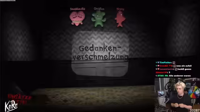 02:27:20Im Jackbox-Spiel 'Patiently Stupid' werden die Teilnehmer mit dem Problem konfrontiert, 'immer Kondome mit Erdbeergeschmack zu vergessen'. Als Lösung wird eine Erfindung namens 'Erdbeer-Fessel' entwickelt, die ein am Körper befestigtes Kondom darstellt. Die Präsentation der Erfindung wird als holprig beschrieben. Weitere Teilnehmer präsentieren ebenfalls skurrile Ideen wie 'Zungenbeißer', 'Lolita Lochfrau' und 'Mutterkoffer', die im Chat für Aufsehen sorgen und viel Gelächter auslösen.