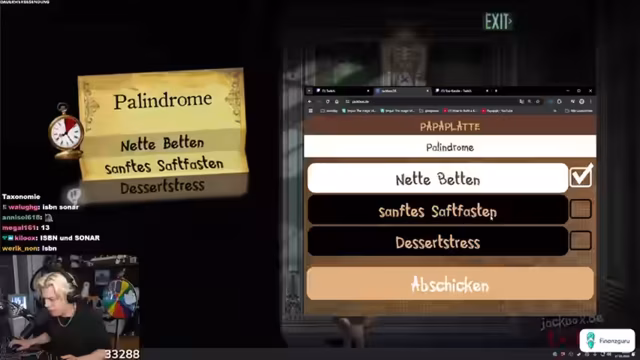 03:22:48Eine neue Spielrunde beginnt mit einer Frage zur Sprache Pennsylvania Dutch, die der Streamer zu beantworten versucht. Es folgen weitere Herausforderungen, darunter die Wahl einer Stelle in einer Kiste zum Verstecken, die jedoch in einem schnellen Ausscheiden endet. Der Streamer äußert seinen Frust über das Spiel und sein frühes Ausscheiden. Es folgen weitere Fragen und Aufgaben, darunter das Knacken eines Passworts, bei dem die Zuschauer helfen. Der Streamer gibt Hinweise und versucht, das Passwort zu erraten. Es folgen Fragen zu Oscar-Schauspielerinnen und historischen Figuren, bei denen der Streamer sein Wissen testet. Später im Spiel gibt es eine Aufgabe, bei der man Münzen einwerfen soll, aber der Streamer hat Probleme mit der Eingabe. Er beschwert sich darüber, dass er am Anfang gestimmt hat und nun nichts mehr zu tun hat. Es folgt eine Aufgabe, bei der man im Kreis herumdrehen muss, was der Streamer als schwierig empfindet.