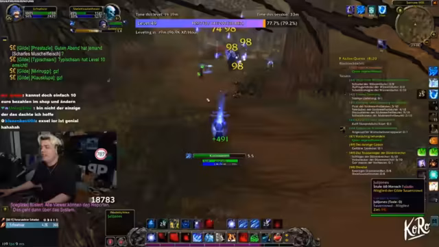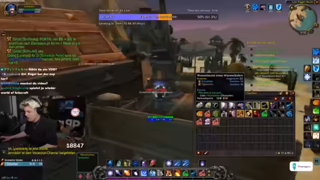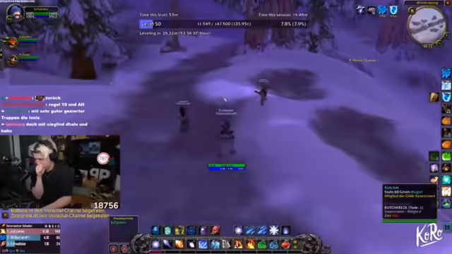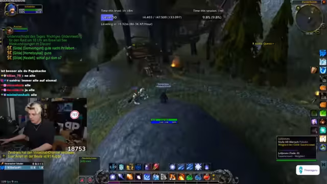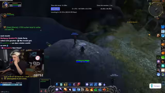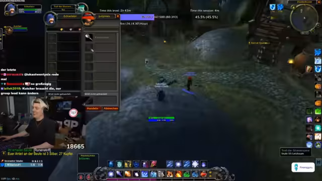 09:22:18Die Stream-Session wird durch technische und spielinterne Herausforderungen unterbrochen. Um das Gruppieren zu optimieren, wird eine Weak Aura gesucht, die automatisches Plündern im Free-for-All-Modus aktiviert. Da das automatische Einladen in die Gruppe nicht funktioniert, wird das manuelle 'Layering' (das Wechseln der Instanz-ID) als Lösung genutzt, um die Gruppengröße zu kontrollieren und die XP pro Stunde zu maximieren.