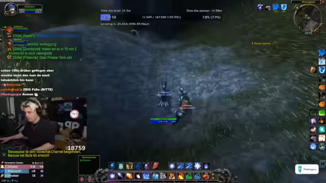07:29:22Nach der Unterbrechung konzentriert sich die Gruppe wieder auf das Kernziel: das schnelle Erreichen von Level 60. Sie laufen zu einem neuen Spot, um die letzten Erfahrungspunkte zu sammeln. Dabei wird der Chat mit Kommentaren über anstehende Raids und Pläne für die Zukunft gesättigt. Der Streamer träumt von zwei 40er-Raids am 22. und davon, die finale Größe von 81 Level-60er Charakteren zu erreichen, was die Motivation für das laufende Grinding weiter steigert und das Projekt Excelsior vorantreibt.