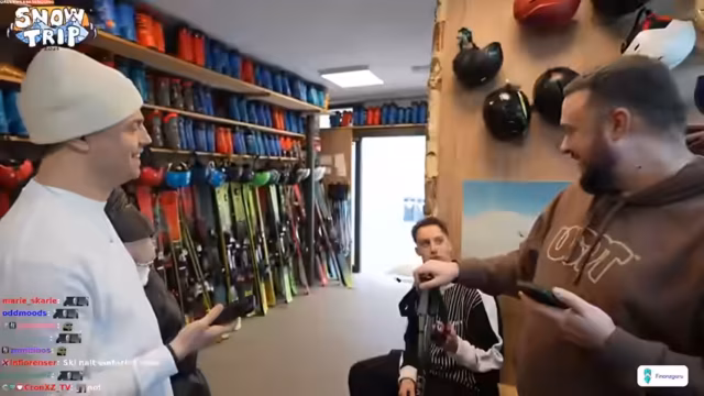 00:17:48An der Skiverleihstation angekommen, treten die Streamer in Kontakt mit einem lokalen Händler, der sie zum Skiverleih fährt. Dort versuchen sie, passende Skischuhe zu finden, was aufgrund einer verwirrenden Größenmessung und Schummlereien bei den Schuhgrößen zu einer Herausforderung wird. Die Gruppe bucht Ski für einen Teilnehmer, da die anderen Snowboard fahren. Eine Rückkehr am nächsten Tag ist geplant. Nachdem die Ausrüstung besorgt ist, machen sie sich auf den Weg zum Haus, wobei sie sich zunächst verlaufen, es aber letztendlich finden und aus dem Auto ausladen.