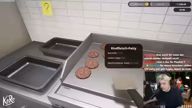 05:08:17Die erste Zeit im Burgerladen wird von chaotischen Arbeitsabläufen und internen Konflikten geprägt. Ein Mitarbeiter überfordert ist, während der Streamer an mehreren Stellen gleichzeitig eingreifen muss. Es kommt zu Diskussionen über die Arbeitsverteilung und Rollen. Ein Mitarbeiter muss die Burger braten, während ein anderer am Grill arbeitet und zusätzlich für die Bestellungen zuständig ist.