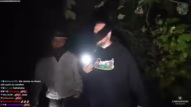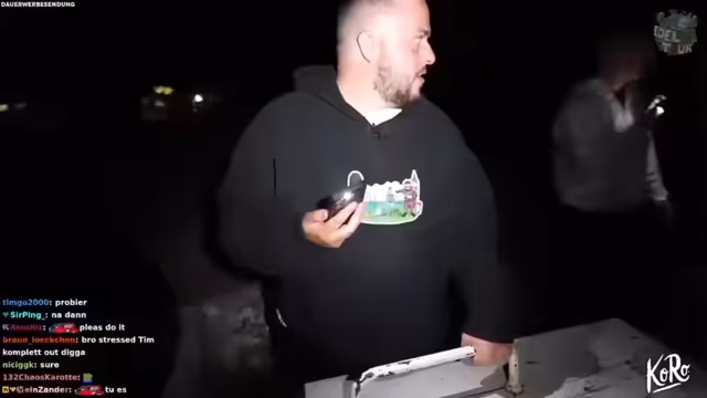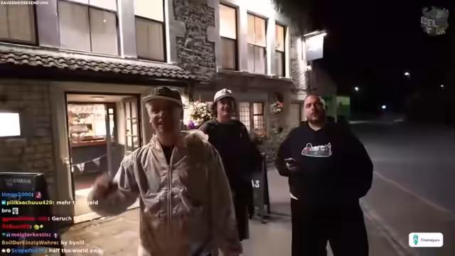 11:24:35Die nächtliche Umgebung wird zunehmend unheimlich, und die Streamer stellen sich vor, wie es wäre, allein in dieser Gegend zu sein. Sie entdecken ein verlassenes Gebäude, das wie eine Forschungsstation aus 'Stranger Things' aussieht, mit einem roten Licht und Videoüberwachung. Sie recherchieren den Namen der Firma, 'Rotorq Contrills', und finden eine negative Online-Bewertung. Die Gruppe diskutiert über die Arbeitsweise von Produktionshallen und ob dort rund um die Uhr Licht brennt. Sie begegnen schließlich einer Gruppe von Einheimischen, die an einem Lagerfeuer sitzen. Nach einer kurzen Vorstellung und einem Austausch über ihre Reisepläne, einschließlich eines Besuchs in Edinburgh, verabschieden sie sich, da die Stimmung der Gruppe als etwas unheimlich empfunden wird.