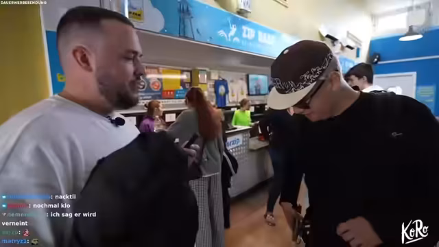 00:50:03Im Spielcenter versuchen die Streamer, ihr Glück bei einem Schießspiel. Sie tauschen fünf Pfund in Münzen um, um die Ziele abzuschießen und einen Preis zu gewinnen. Trotz mehrerer Versuche und Nachladens der Korkengewehre gelingt es ihnen nicht, die gewünschten Süßigkeiten zu gewinnen. Dominik und seine Freunde schießen immer wieder daneben, was zu Frustration führt. Als sie schließlich ein Ziel treffen und der Preis nicht herunterfällt, bitten sie einen Mitarbeiter um Hilfe. Dieser verspricht, jemanden anzurufen, was die Streamer als möglichen Betrugsversuch interpretieren, da sie vermuten, dass er einfach nur Zeit schinden will. Die Situation sorgt für Belustigung und Diskussionen im Chat über die Ehrlichkeit des englischen Glücksspiels.