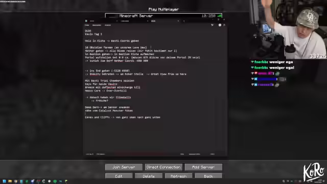 01:45:28Kevin findet kein Portal. Kevin ist im Netherite gefangen. Kevin braucht im Nether länger als Basti. Kevin ist viel zu tief. Kevin wird von Phantomen angegriffen. Kevin hat keinen gedamaged. Kevin macht die Musik wieder an. Kevin kümmert sich um eine Savanne. Kevin ist in Nullkommanix am Spawn. Kevin muss die Raketen auffrischen und ins End gehen. Kevin gibt sein Bestes. Der Nether hat todelange gedauert. Basti gibt Kevin die Chords vom End. Kevin muss 6000 Blöcke traveln. Kevin fliegt effizienter. Kevin hat keine Ausbildung gemacht, wie man effizient mit Elytra fliegt. Kevin musste Chatflame. Basti kann heute komplett ohne Legs spielen. Basti fragt, warum Kevin manchmal den Creeper instant killt und manchmal nicht. Kevin nimmt Gunpowder mit. Kevin nimmt Knochen für die Wölfe mit. Kevin findet einen Warm Ocean mit einer Ruine.
