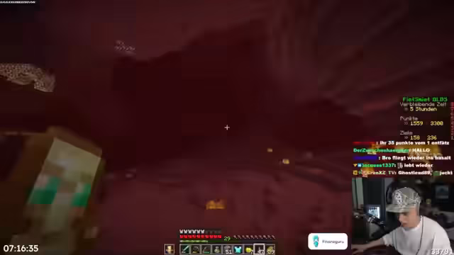 01:10:16Zu Beginn des Streams plant der Streamer, zuerst Holz zu sammeln und dann nach Gunpowder zu suchen. Bei Nacht soll er Creeper farmen. Für den Nether sind mehrere Achievements vorgesehen: Durchquerung aller Biome, Besuch eines roten Waldes und eines Basalt Deltas sowie das Betreten einer Bastion, wo eine Kiste geöffnet werden muss ohne die Piglins zu verärgern. Es werden 875 Blöcke im Nether und über 7.000 Blöcke in der Oberwelt gereist, um Punkte zu sammeln. Koordinaten im Nether werden bei minus 600 und 900 festgelegt, wo ein Portal bei 0,0 gebaut wird.