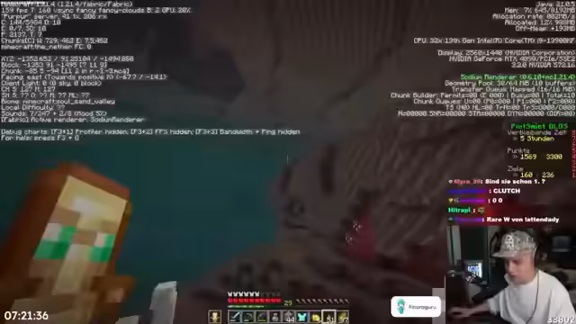 01:32:15Basti äußert Schwierigkeiten, Monster für ein Achievement zu finden, insbesondere Phantome. Plötzlich erscheinen Phantome, was seine Freude auslöst, da er nun das Achievement machen kann. Kevin steckt währenddessen im Netherrack fest. Basti nimmt Quarz für seine Elytra mit. Kevin fragt, wie viele Hits ein Phantom in der Dia-Axt aushält. Sie bemerken, dass die Phantome gefixt wurden. Stegi ist im Nether gestorben. Basti äußert Besorgnis, dass er nun auch sterben könnte. Kevin fragt, ob er auf 69er Höhe im Nether eher runter oder hoch soll, um rauszukommen. Basti ist beinahe ohne Elytra losgeflogen. Er bereitet Setups für Kevin vor, falls er das auch nochmal machen muss. Kevin soll erst das 0-0-Ding machen. Kevin baut ein Portal und reist in die Overworld, um ein Achievement zu erhalten. Basti lobt Kevins Vorbereitung.