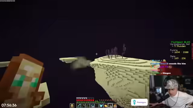 02:15:35Im EndDimension müssen sie verschiedene Aufgaben erfüllen, darunter das Finden einer Endcity und das Überleben von Angriffen. Der Streamer nutzt seine Elytra, um durch das End zu fliegen und versucht, bestimmte Achievements zu erreichen. Nach erfolgreichen Sammlungen und Combos beschließen sie, ins Überwelt zurückzukehren, um ihre Basis weiter auszubauen und weitere Ressourcen zu sammeln.