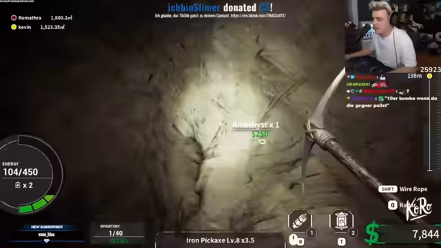 03:44:06Der Stream startet mit dem gemeinsamen Spielen in einem Abbau-Spiel. Der Streamer und der Co-Streamer arbeiten zusammen, um Ressourcen wie Tofu und Schimmel zu farmen, wobei sie über die Eigenschaften von Tofu diskutieren und das Gameplay als „satisfying“ und „insane“ bezeichnen. Sie erkunden eine Höhle, sammeln Teleporter und bauen an ihrer Mine, wobei sie mit verschiedenen Werkzeugen wie Pickaxe und Dynamit experimentieren, um schneller voranzukommen und wertvolle Erze zu finden.