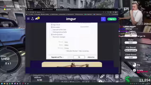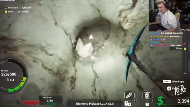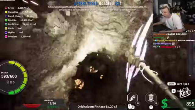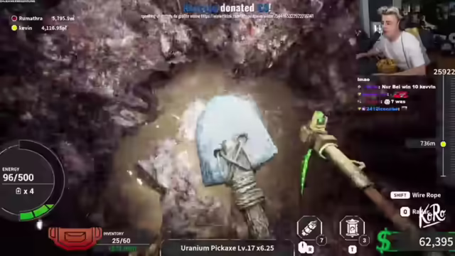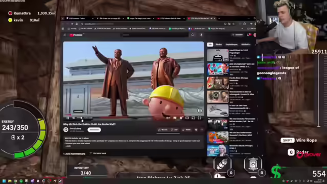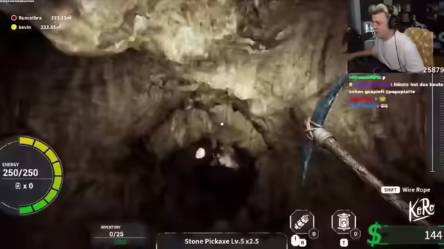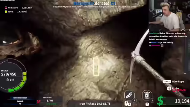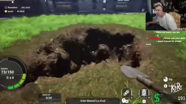 01:56:57Ein entdeckter Programmfehler in der Anzeige der Kubikmeter sorgt für Belustigung und Ärger. Es wird überlegt, ob sich ein Backpack-Upgrade lohnt und wie die Batterie effizient aufgeladen werden kann. Beim weiteren Graben werden Arbeiter entdeckt, die in einem Hamsterrad gefangen sind und an Videos erinnern, die man nachts um 3 Uhr sieht. Diese Arbeiter werden als Lohnsklaven bezeichnet, im Gegensatz zu den selbstständigen Streamern. Einer der Streamer hängt den anderen beim Abbau ab, was zu dem Problem führt, dass er nicht mehr aus dem Loch herauskommt. Es wird beschlossen, eine Treppe zu bauen, idealerweise eine Wendeltreppe. Ein Wire Rope wird gekauft, um den Aufstieg zu erleichtern. Es stellt sich heraus, dass es verschiedene Schaufeln gibt und man die beste auswählen sollte. Das Aufladen der Batterie kostet nun Geld, was als "Insane Scam" bezeichnet wird. Der Wunsch nach einem Hilti-Radio auf dem Bau kommt auf. Es wird eine Höhle entdeckt, in der sich eine Kiste mit einem Climb Boost und einem Warp Stone befindet. Die Energie reicht nicht aus, um zu entkommen, daher muss die Energie gelevelt werden. Durch das Einsammeln einer Batterie wird die Energie automatisch aufgeladen. Einer der Streamer ist "insane rich" und kauft Energie-Upgrades.