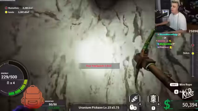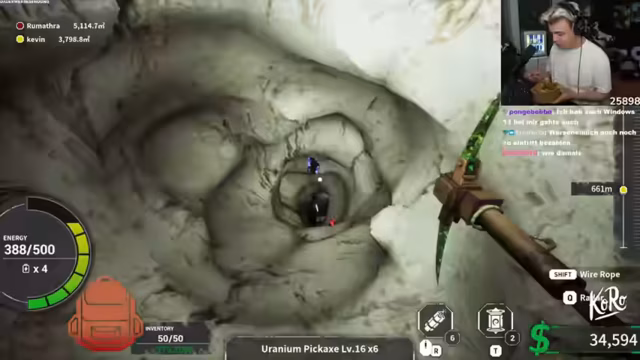 03:32:27Nach der kontemplativen Pause geht es zurück ins Mining-Spiel. Die Fortschritte sind spürbar: der Streamer hat eine Uranium-Pickaxe erreicht (Level 17) und baut massiv Rohstoffe wie Diamanten und Uranium ab. Es entwickelt sich ein "friendly rivalry" mit seinem Mitspieler, bei dem die gemachten Kubikmeter und der Erfolg verglichen werden. Der Weg zu den nächsten Teleportern ist jedoch lang und anspruchsvoll, und er überlegt, ob er ein Upgrade für den Rucksack benötigt, um mehr Ressourcen mitnehmen zu können.