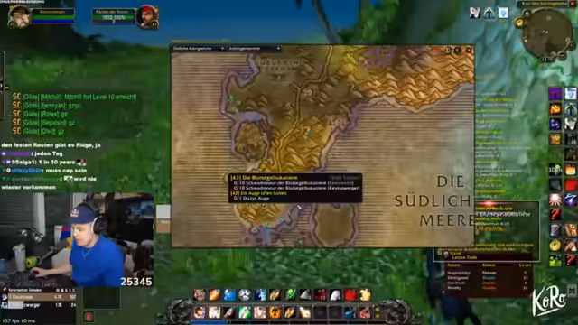 07:08:39Nach einer erfolgreichen Phase, in der sie mehrere Gruppen von Gorillas ohne größere Probleme ausschalten, können sie ihre Quests in der unübersichtlichen Stadt Booty Bay abgeben. Dies stellt sich als umständlich heraus, da sie freien Inventarplatz schaffen müssen. Sie bewerten ihren Standpunkt feststellen und planen den weiteren Verlauf, wobei der Streamer ein ambitioniertes Ziel für den nächsten Tag – Erreichen von Level 45 – vorschlägt.