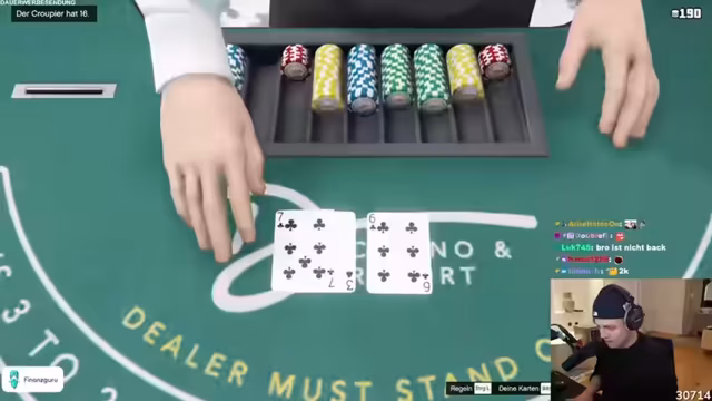 03:29:49Der Wechsel zum Blackjack-Tisch erfolgt. Die Grundregeln werden geklärt, und der Dealer zieht Karten, bis er 17 oder mehr hat. Während des Spiels treten erhebliche technische Schwierigkeiten auf, insbesondere bei Hugo, der scheinbar Verbindung und Lobby-Probleme hat. Versuche, eine private Session zu erstellen und die anderen Spieler einzuladen, scheitern zunächst. Gleichzeitig wird das Spiel selbst fortgesetzt, mit emotionalen Reaktionen auf Gewinne und Verluste. Der Chat gibt Tipps, die jedoch nicht immer helfen. Der Abschnitt endet mit der Frage, wie man Geld von der Bank abheben kann, da keine Bargeld mehr vorhanden ist.