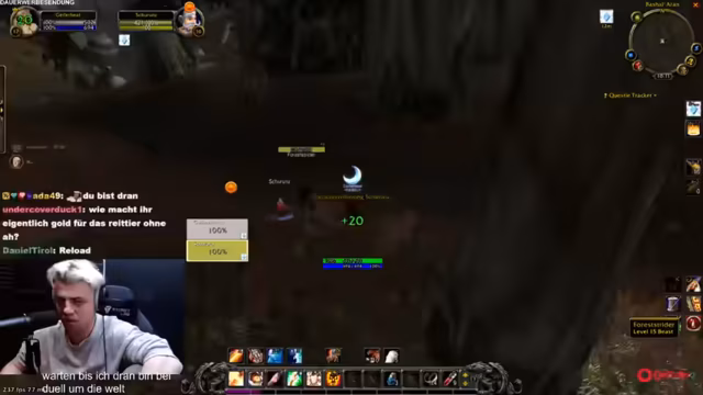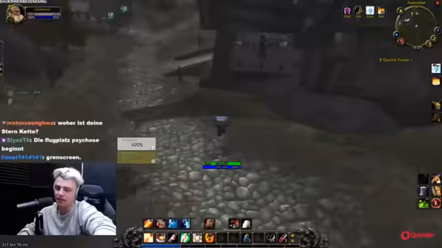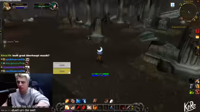 04:36:54Nach dem intensiven Stunt geht es zurück zum normalen Gameplay in 'World of Warcraft'. Wieland spielt mit einem Streamer namens Rhys und spricht über die 'Dungeon-Sucht'. Es werden zusätzliche Viewer wie Dominik und Aki erwähnt, die in den Stream eintreten. Die Stimmung ist wieder lockerer und familiär. Es wird über tägliche Aufgaben und Gameplay-Entscheidungen gesprochen und Wieland interagiert rege mit den Zuschauern im Chat, die über das soeben erlebte Duell um die Welt diskutieren und auch ihre eigenen Erlebnisse teilen.