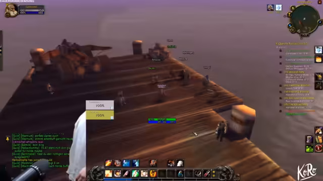 01:53:20Die Konversation dreht sich um die Fortsetzung der World-of-Warcraft-Quests. Wieland und sein Partner beschließen, zunächst zu einer Stadt zurückzukehren, um abzugeben und dann die Quest fortzusetzen. Dabei kommt es zu technischen Diskussionen über Loot-Systeme und Levelvoraussetzungen. Gleichzeitig unterhält sich Wieland mit dem Chat über das Ausbleiben von Drops in einem Gebiet und klagt über den Ärger, den das verursacht.