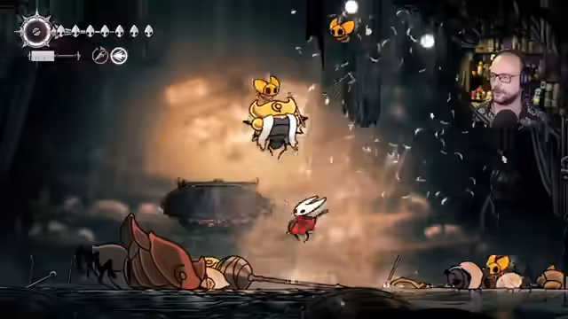 07:11:42Der Streamer beginnt einen Bosskampf gegen die Honigbiene, die als besonders schwierig und bösartig beschrieben wird. Er kämpft mit Doppelsprung und neuer Nadel und besiegt die Biene nach mehreren Versuchen. Als Belohnung erhält er ein Maskenteil und Hornfragmente. Der Kampf verläuft ohne Wände, was ihn anders und schrecklicher macht als vorher.