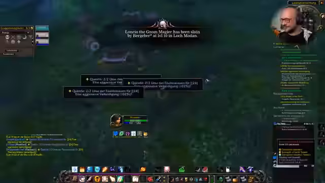 13:01:02Ein Spieler nimmt eine schwierige 32er-Quest an, die drei Bosse in einer Höhle verlangt. Die Gruppe ist sich unsicher, ob sie die Quest alleine bewältigen kann, da sie sich aus zwei 27er und einem 28er Charakter zusammensetzt. Es kommt zu einer Diskussion, ob der Versuch unternommen werden soll, und nach Bedenken im Chat und dem eigenen Bedürfnis, den Charakter nicht zu gefährden, wird die Quest vorerst wieder fallen gelassen. Es herrscht Konsens, lieber vorsichtig zu spielen und sich auf sicheres Leveln zu konzentrieren.
