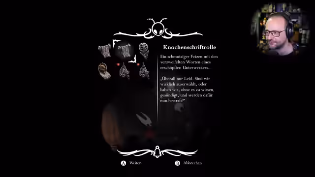 05:30:40Die Spielenden untersuchen einen Faden, der von einer Schale ausgeht und dessen Bedeutung im Kontext der Pilgerfahrt erörtert wird. Es wird die Notwendigkeit betont, zu einer Bank zurückzukehren, um einen Talisman auszurüsten. Der Streamer äußert Belustigung über ein ausgesprochenes Wort und interagiert kurz mit einem Zuschauer. Es wird spekuliert, ob mit einer Spritze etwas beim Schmetterling oder den Würfeln bewirkt werden kann, wobei der Schmetterling als möglicher Hinweis auf Hollow Knight interpretiert wird. Das Weblicht wird gefunden, dessen schwaches Licht untersucht werden soll, eventuell in Verbindung mit dem Professor, bei dem zuvor eine Aufgabe erledigt wurde. Die Reaktion beim Verlust des blauen Herzens wird als cool empfunden. Es wird die Assistentin Kanasei getroffen, bei der das Weblicht mitgenommen wird. Es wird der namenlose Pilger gesucht. Es wird festgestellt, dass Tote singen können, aber nicht jeder. Das Weblicht wird bei Leichen eingesetzt. Es wird ein Schimmernder von Webern hergestellter Apparat gefunden, dessen Kern ein schwaches Licht verströmt.