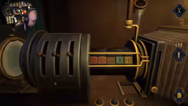 04:16:17Der Streamer konfrontiert sich mit einem Rätsel, das die Erfindung des ersten Bewegtbildes thematisiert. Er muss eine Art Vorführgerät bedienen, das drei Farbbänder (Blau, Gelb, Grün) mit Bildern eines Pferdes in verschiedenen Phasen des Galopps durchläuft. Nach einigem Probieren und der Beobachtung der Anzahl der angehobenen Beine in den einzelnen Farben, erkennt er, dass er die Geschwindigkeit der Bänder anpassen muss, um sie zur Überlagerung zu bringen. Als er die Bänder synchronisiert, erscheint das vollständige Bild des galoppierenden Pferdes und löst das Rätsel.