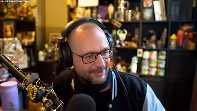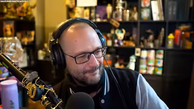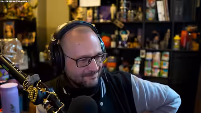 00:53:54Während des Streams wird ein Teil der Streaming-Routine und die Interaktion mit der Community sichtbar. Der Streamer erwähnt, dass er nur bis 23 Uhr streamen kann, da er sich danach Zeit für seine Frau nehmen möchte. Es finden häufige private Gespräche im Hintergrund statt. Des Weiteren wird die Technik, wie die Sony-Kamera VZ-E10 II, erwähnt und das unscharfe Kamerabild wird durch den Hintergrund erklärt, der Staub verdecken soll. Die Zuschauer interagieren intensiv mit der im Hintergrund stehenden Figurenkollektion und dem Setup.