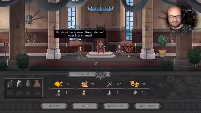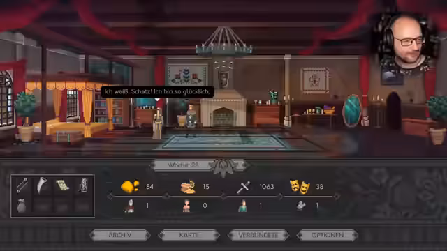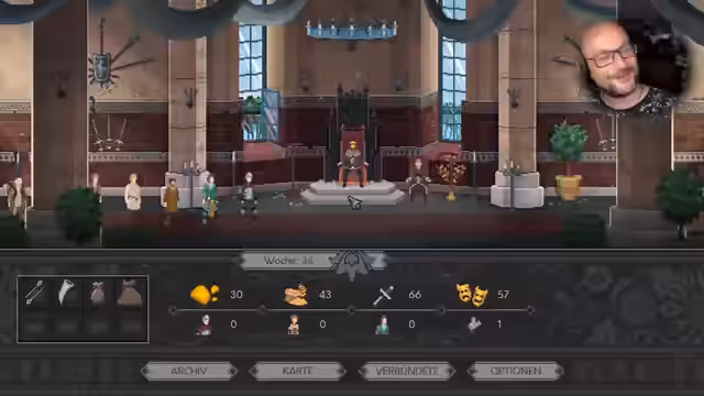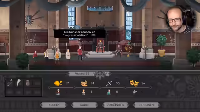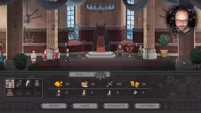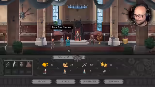01:34:38Nach der Pause kehrt der Streamer zurück und setzt das Spiel Yes, Your Grace fort. Er befindet sich in Woche 20 des Spiels und hat sich zwischenzeitlich Gedanken über die Charakterbeziehungen und die Handlung gemacht, was zu neuem Misstrauen gegenüber der Hexe geführt hat. Es werden strategische Entscheidungen für die kommende Woche besprochen, wie die Armee zu ernähren und die Hexe für eine Aufgabe freizusetzen.