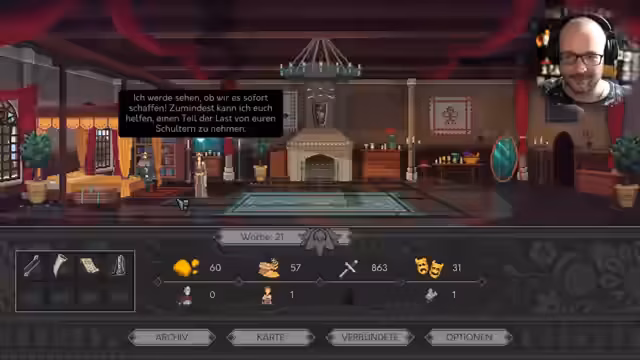 00:47:09Der Streamer kehrt zu Yes, Your Grace zurück und beschreibt die aktuelle Spielsituation, in der er mit Figuren interagiert, deren Absichten er misstrauisch ist. Nach einer Woche Abstand vom Spiel hat er das Gefühl, seinen Charakteren nicht mehr zu vertrauen und ist aufmerksam für mögliche Verratshandlungen. Er zögert, einem Charakter zu vertrauen, obwohl dieser scheinbar an seiner Seite steht.