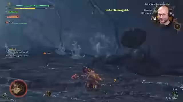 13:15:46Der Streamer kehrt von einer kurzen Pause zurück und startet einen Kampf gegen Ajarakan. Er erklärt grundlegende Gameplay-Elemente für Zuschauer, die Monster Hunter noch nicht kennen. Die grüne Leiste oben links ist die Lebensleiste, darunter die Ausdauerleiste. Als Dualblade-Spieler verbraucht er Ausdauer nur im Dämonenmodus oder beim Rennen. Das Blaue unter der Ausdauerleiste ist der Schärfebalken, der die Schärfe der Waffe anzeigt. Es gibt drei Schärfestufen: Blau, Grün und Gelb (und Rot). Er aktiviert den Fokus-Modus, um verwundbare Stellen am Monster zu finden und greift dann gezielt diese Stellen an. Der Balken unter dem blauen Balken ist der Dämonen-Modus-Balken, der die Dämonen-Energie auflädt. Sobald dieser voll ist, kann er in den Erz-Dämonen-Modus wechseln, der noch stärkere Attacken ermöglicht. Er erklärt, dass die Explosionen, die man hin und wieder sieht, von dem Explosions-Element auf seiner Waffe stammen, welches sein Lieblingselement ist.