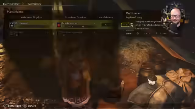 08:10:39Der Streamer erhält ein Kompliment für seinen entspannten Stream und seine Begeisterung. Er erfährt, dass er Jäger-Rangpunkte durch Quests und Anfragen verdienen kann, um seinen Jäger-Rang zu erhöhen und neue Ziele freizuschalten. Bonusbelohnungen für Felderkundungen in hochrangigen Umgebungen wurden freigeschaltet. Er versteht, dass er Monster angreifen muss, um eine Felduntersuchung bzw. Quest zu starten. Sein Jäger-Rang bestimmt, welche Monster er ins Visier nehmen kann. Der Streamer bedankt sich für die vielen lieben Kommentare. Er erfährt, wo er seinen Helm ausstellen kann. Mitty, sein Palico, möchte hilfreicher sein und Vital-Wespen nutzen, um ihn während der Jagd zu heilen. Der Streamer muss eine neue Vitalitäts-Wespe fangen. Er wird vor Spoilern gewarnt. Er erfährt, dass er mit Nata handeln kann, um Materialien zu bekommen, ohne zu reisen. Er tauscht einen Viollkiesel gegen Machtsamen. Er findet das Spiel mega geil und entdeckt etwas Neues. Er kann jetzt hochrangige Ausrüstung schmieden und verbessern. Er muss Monster in hochrangigen Umgebungen jagen, um die dafür nötigen Materialien zu bekommen. Hochrangige Rüstung kann als Dekorrüstung angelegt werden.